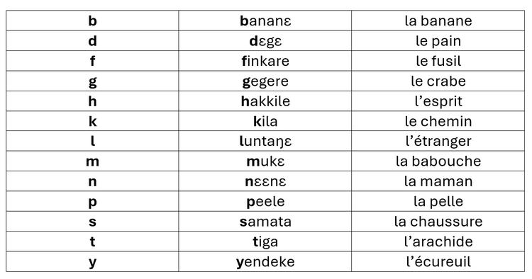 En français, quand deux ou trois sons de consonnes se suivent, on écrit et prononce chacune. En Mogofin ils n’existent pas.
